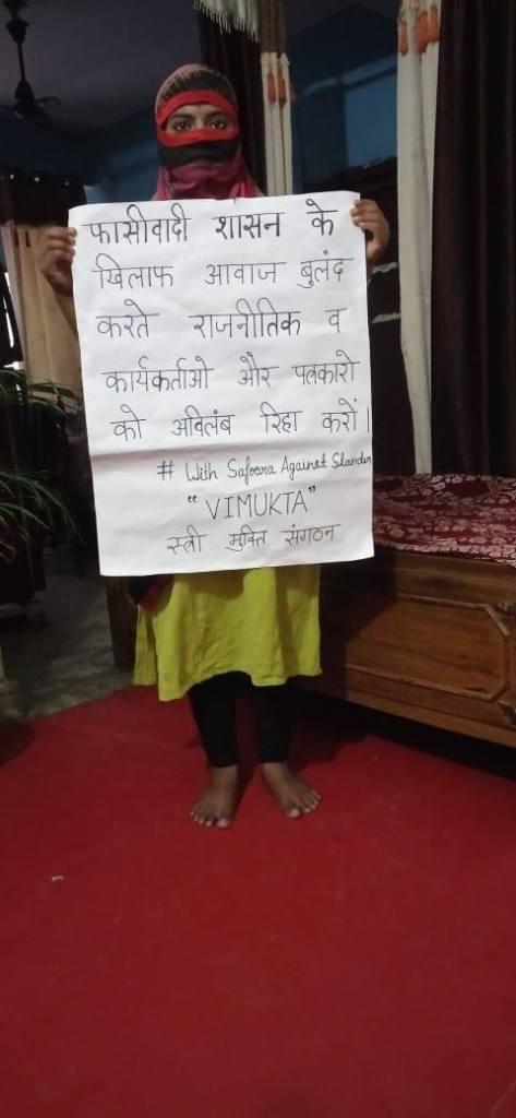 हम केंद्र सरकार से सफ़ुरा और अन्य सभी राजनीतिक कार्यकर्ताओं की जल्द से जल्द रिहाई की मांग करते है और वैश्विक महामारी में अपनी जरूरतों तक को पूरा करने में असहाय कर दी गई आम गरीब व मेहनतकश जनता के खिलाफ सरकार की तमाम जनविरोधी, मजदूर विरोधी, महिला विरोधी नीतियों का विरोध करते है।