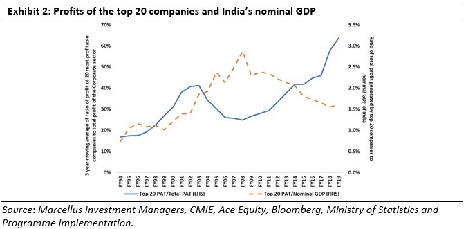 पहला ग्राफ: “इस चार्ट का उभय अक्ष सम्पूर्ण भारतीय कॉर्पोरेट क्षेत्र के मुनाफे में से 20 शीर्ष कंपनियों के मुनाफे की मात्रा के अनुपात के 3 साल के गतिमान औसत को दिखाता है। चार्ट से स्पष्ट है कि विश्व की छठी सबसे बड़ी अर्थव्यवस्था में 1990 के दशक में अर्थव्यवस्था के उदारीकरण के वक्त शीर्ष 20 लाभर्जित करने वाली कंपनियों का हिस्सा 14% से बढ़कर अब लगभग 70% पर पहुंच गया है।”