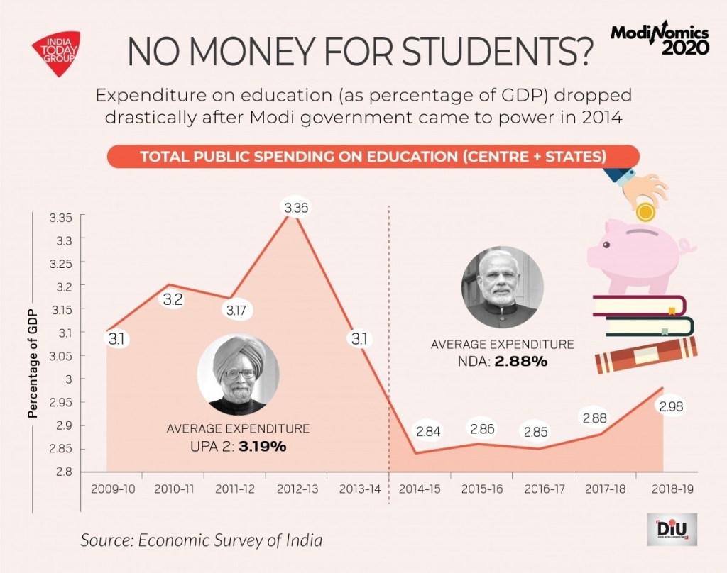 The NEP proposes a target of 6% of GDP for expenditure on education which has been heavily propagated by the government and even praised by some critics. Although the fact which has not been brought on the surface is that this aim of 6% GDP spending on education was highlighted way back in the Kothari Commission Report of 1966 based on which the first National Policy on Education 1968 was formulated. Since then, this target of 6% has remained only a hollow promise of all governments and a distant dream for the citizens. Those who are hopeful of the Modi Government ought to know its track record on education spending since it came to power in 2014. According to Economic Survey of India Reports, the average spending on education by the Modi Government from 2014-15 to 2018-19 has been 2.88% of the GDP. This is even lower than the abysmal record of the UPA-2 Government which had an average of 3.19%. Given the government’s interest in funding education, the unfortunately ambitious target seems nothing more than a pipe dream.