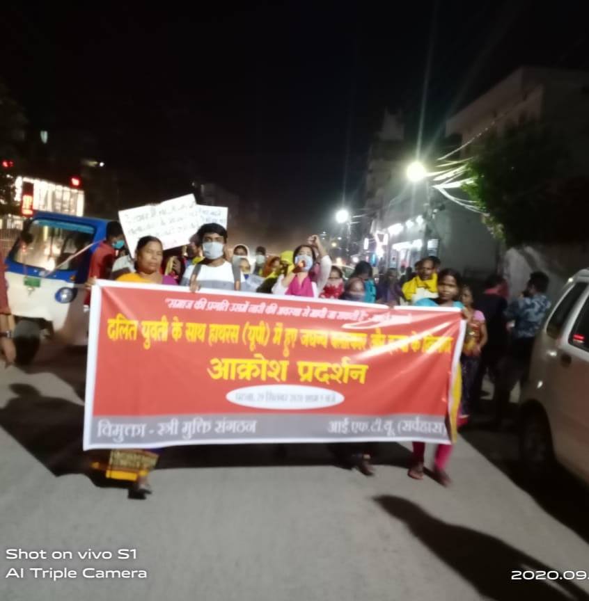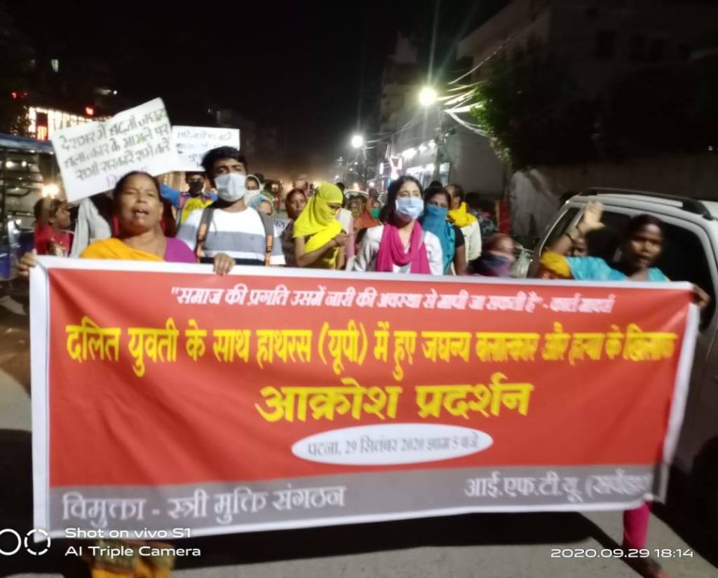 Patna, 29 September 2020: Against the inhuman gangrape and killing of a Dalit teenager in Hathras (UP) and rising violence and crimes against women, a protest demonstration was organized in Patna by women organization Vimukta – Stree Mukti Sangathan and IFTU (Sarwahara).