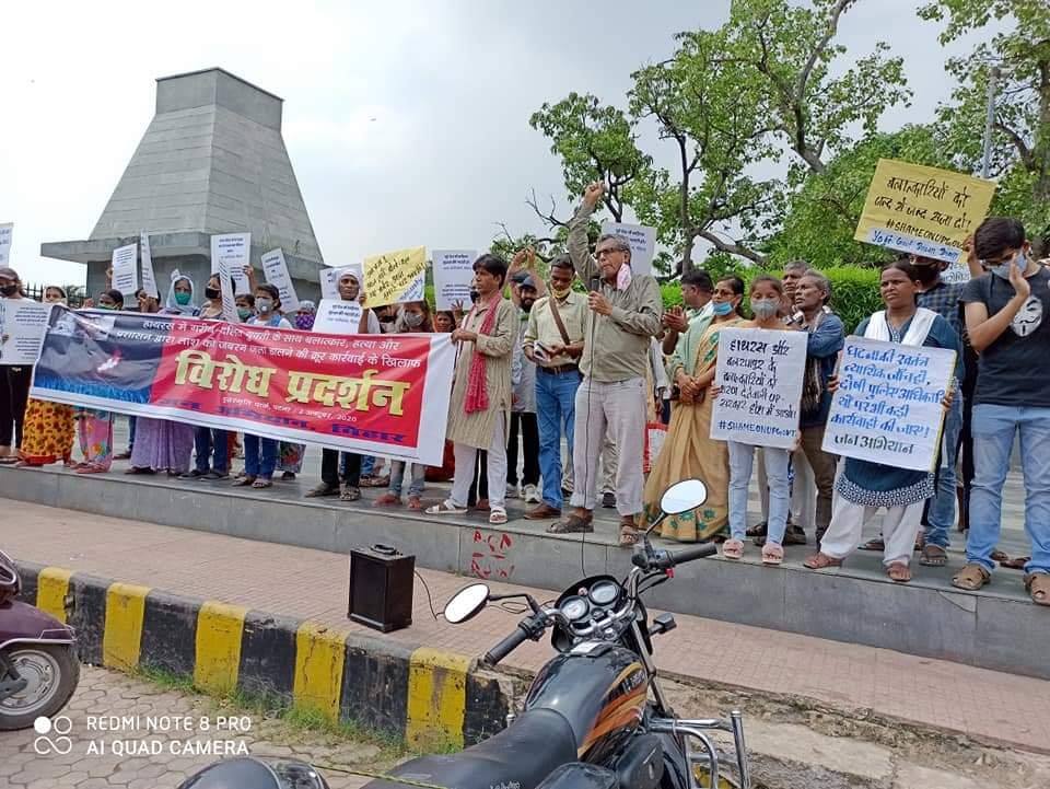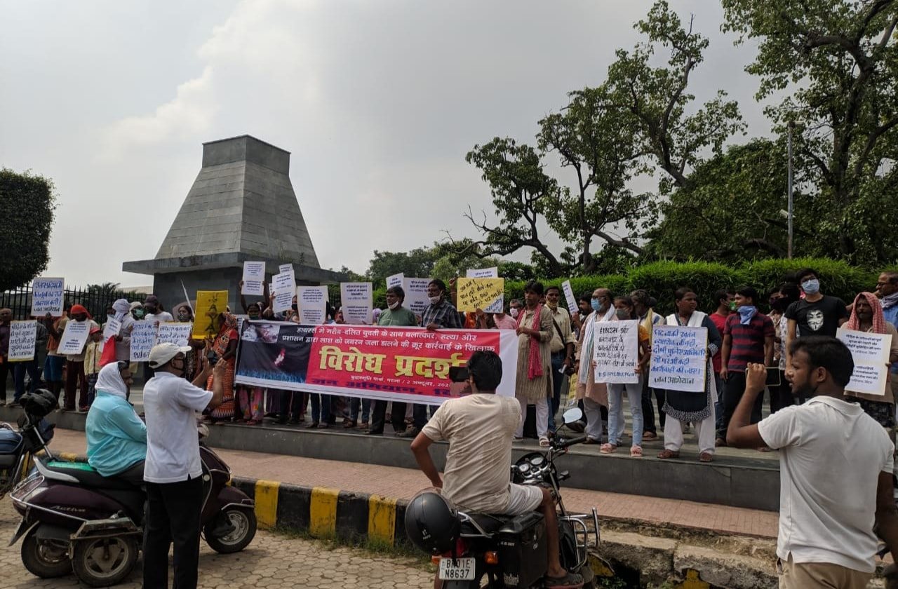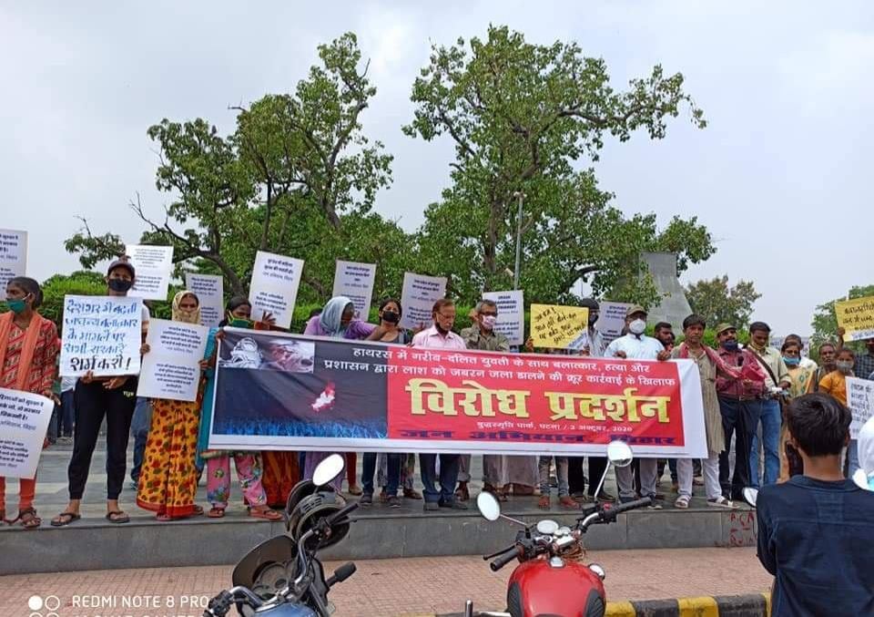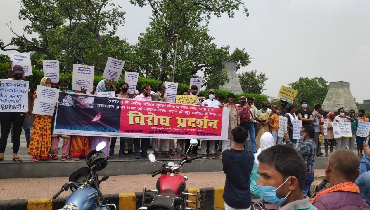 Patna, 2 October 2020: In times of rapidly rising barbaric violence and crimes against women, a protest demonstration was organized at Patna’s Buddha Smriti Park against the gangrape-murder of a dalit teenager in Hathras (UP) on 14th Sept. and the inhuman and barbaric actions subsequently taken by the State viz. forcibly cremating the woman’s body in the middle of the night while deliberately keeping the family members away and constantly pressurizing them and cutting them off from media, lawyers and the civil society.