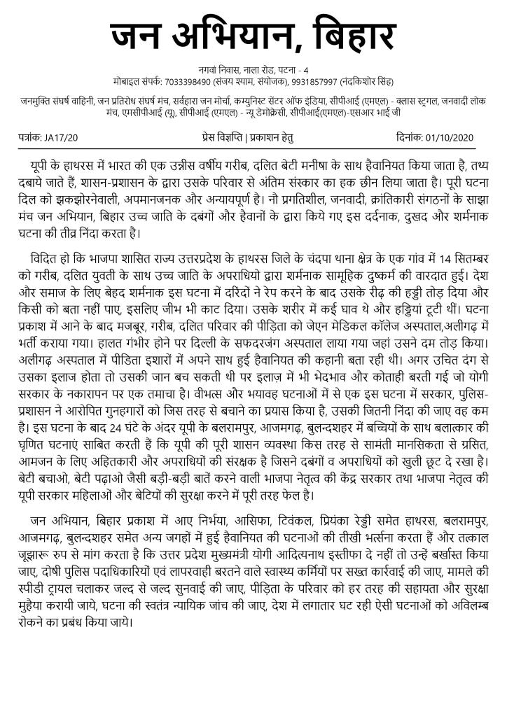 पटना, 2 अक्टूबर 2020: देश भर में महिलाओं पर बढ़ती बर्बर हिंसा व अपराध के माहौल में हथरास (उत्तर प्रदेश) में एक दलित युवती के साथ 14 सितंबर को हुई जघन्य बलात्कार-हत्या और उसके बाद राज्य प्रशासन के अमानवीय व फासीवादी रवैये, जिसके तहत युवती के शव को जबरन उसके परिजनों से अलग कर रात के अंधेरे में जला दिया गया और परिजनों पर लगातार दबाव बनाया जा रहा है, के खिलाफ जन अभियान, बिहार ने पटना के बुद्ध स्मृति पार्क के सामने विरोध प्रदर्शन आयोजित किया।