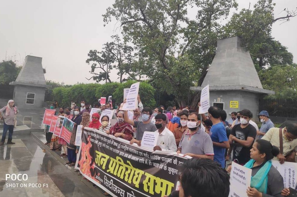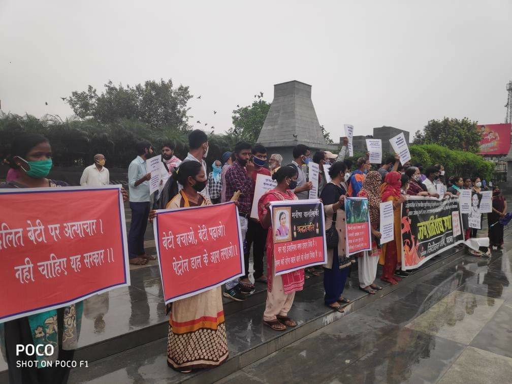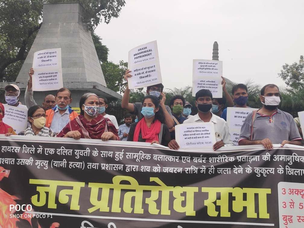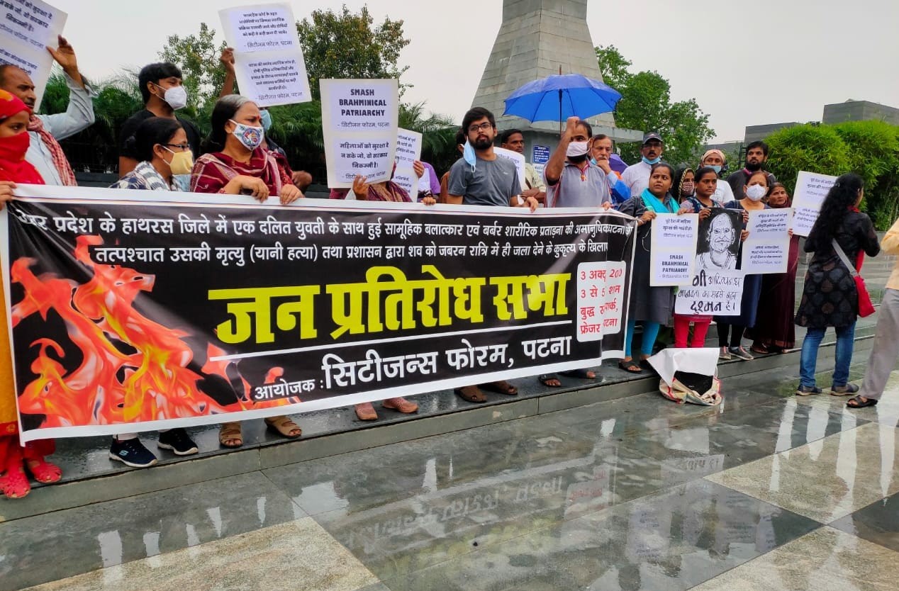 पटना, 3 अक्टूबर 2020: देश भर में महिलाओं पर बढ़ती बर्बर हिंसा व अपराध के माहौल में हथरास (उत्तर प्रदेश) में एक दलित युवती के साथ 14 सितंबर को हुई जघन्य बलात्कार-हत्या और उसके बाद राज्य प्रशासन के अमानवीय व फासीवादी रवैये, जिसके तहत युवती के शव को जबरन उसके परिजनों से अलग कर रात के अंधेरे में जला दिया गया और परिजनों पर लगातार दबाव बनाया जा रहा है, के खिलाफ सिटिज़न्स फोरम ने पटना के बुद्ध स्मृति पार्क के सामने बारिश के बावजूद विरोध प्रदर्शन आयोजित किया।