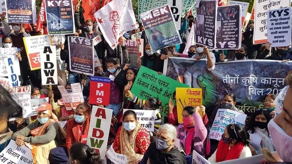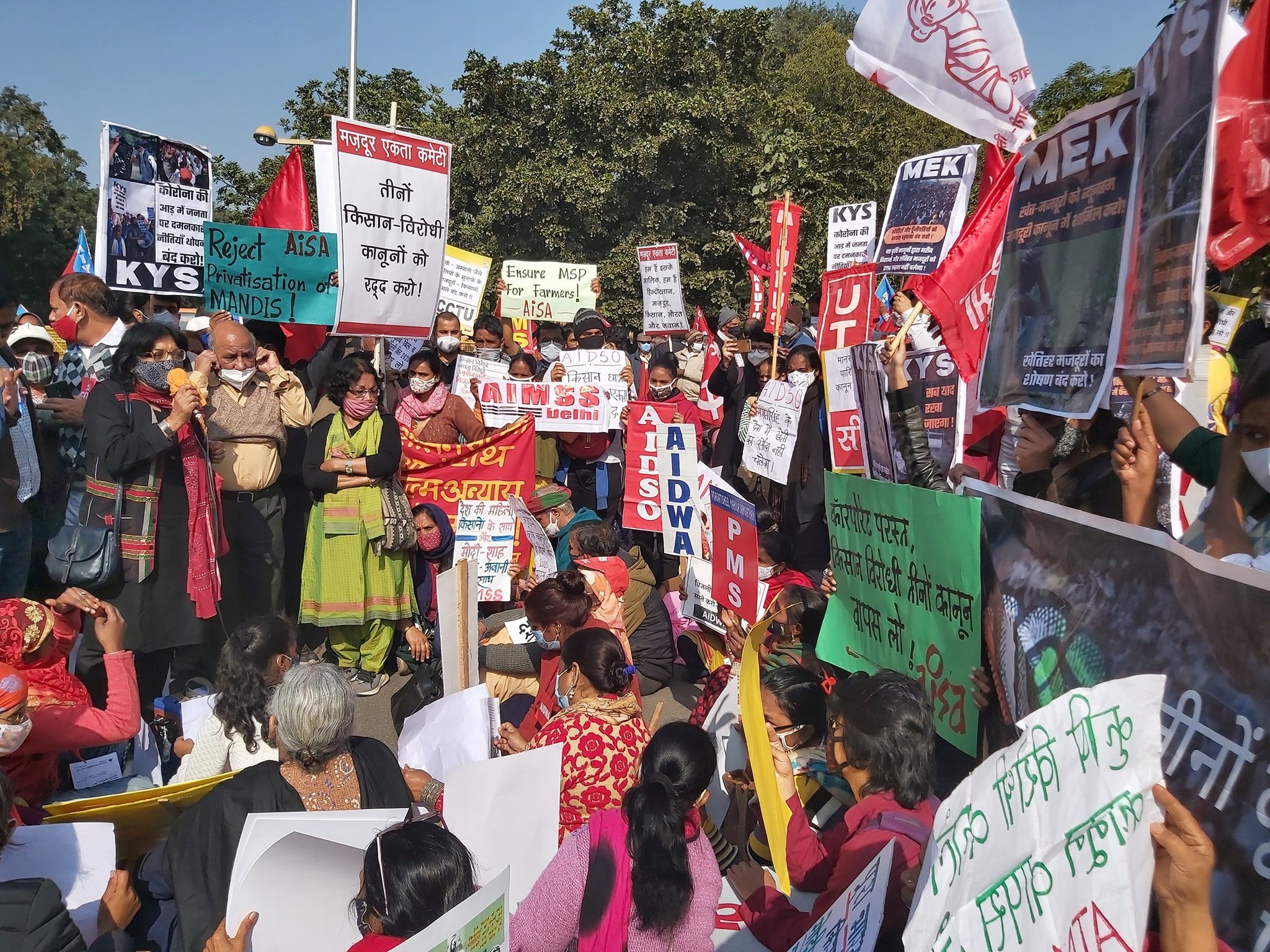 तीन कॉर्पोरेट-पक्षीय कृषि कानूनों के खिलाफ संघर्षरत किसानों के समर्थन में शहीदी पार्क (आईटीओ) पर प्रदर्शन, ट्रेड यूनियन, छात्र-युवा संगठन, महिला संगठन व अन्य वाम जनवादी संगठनों द्वारा ‘किसानों के लिए दिल्ली’ के बैनर तले किया गया