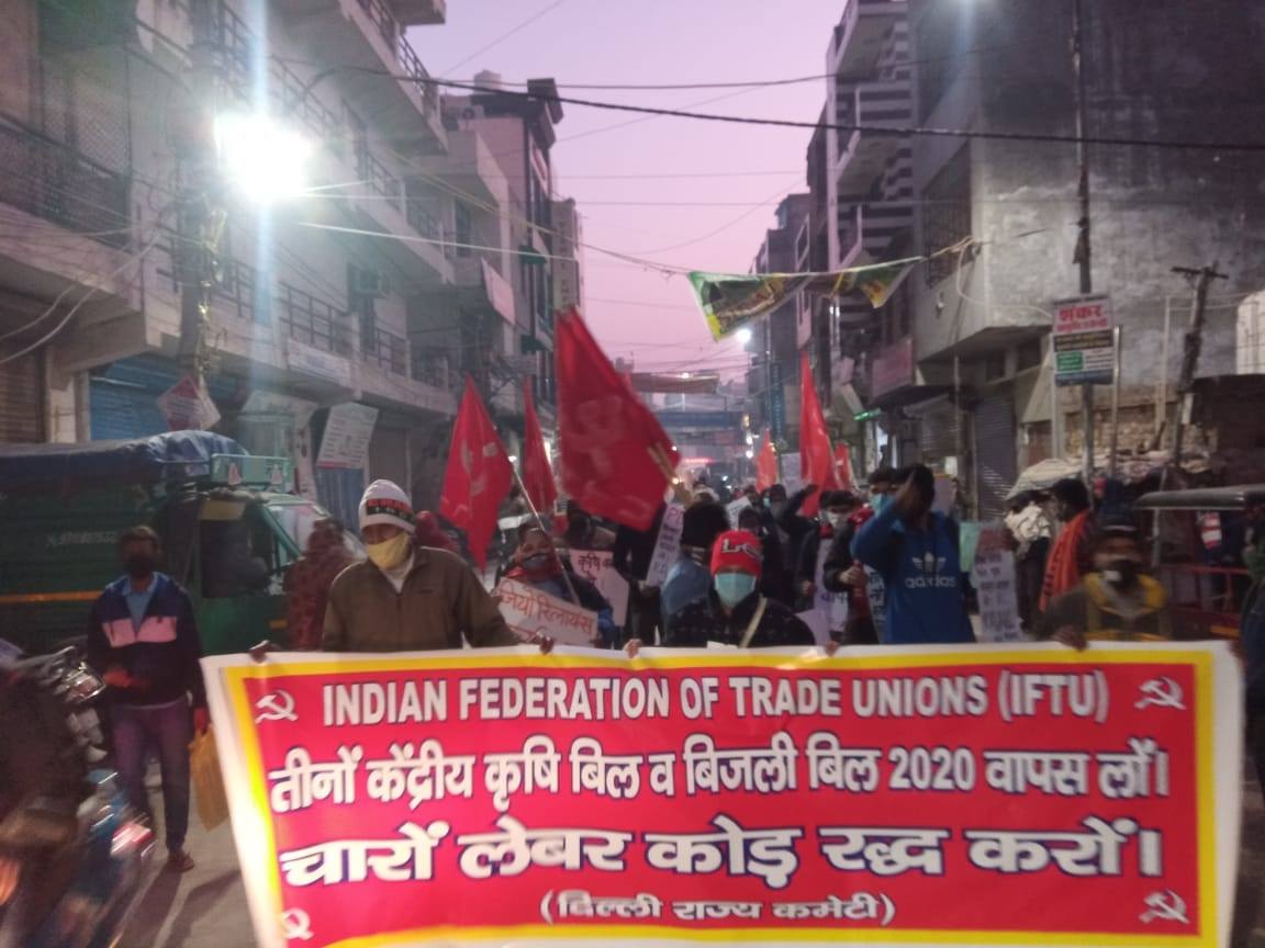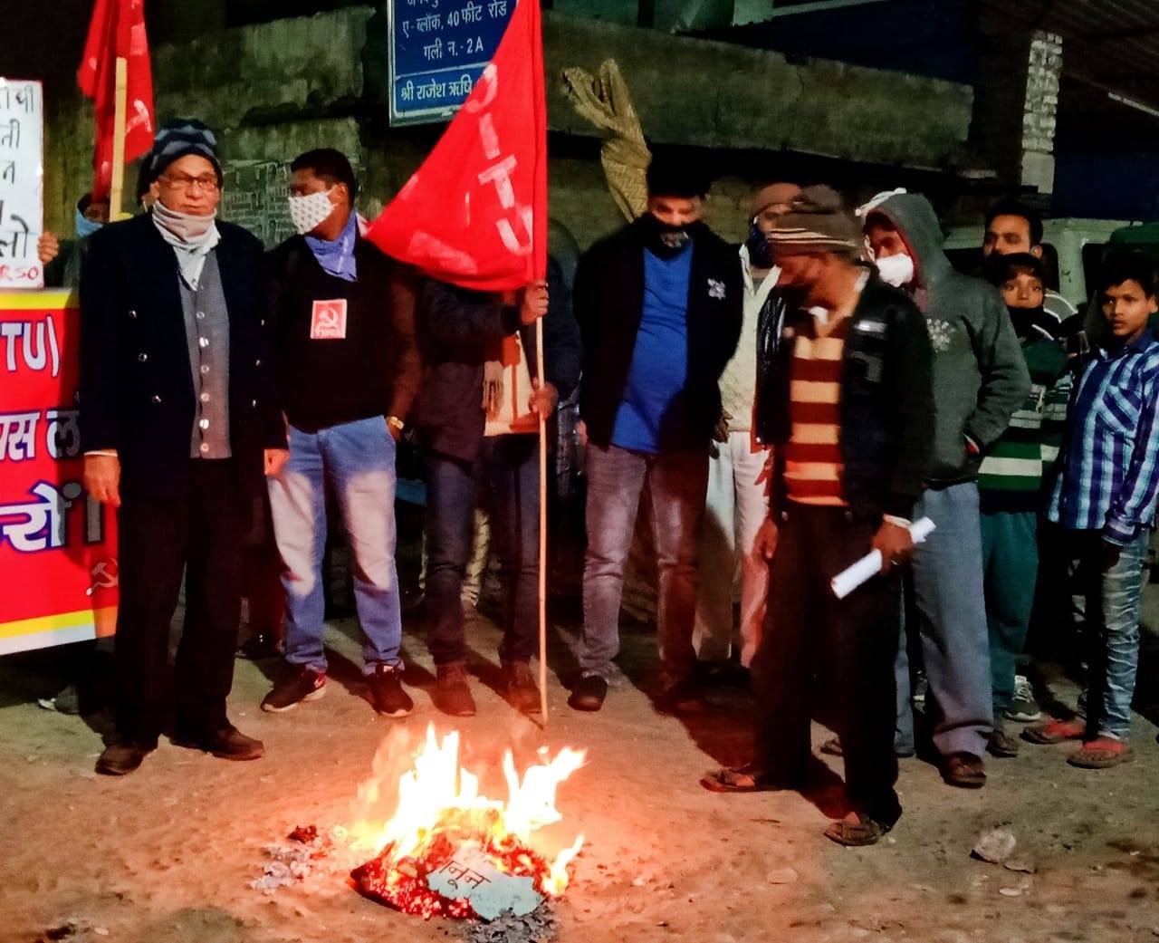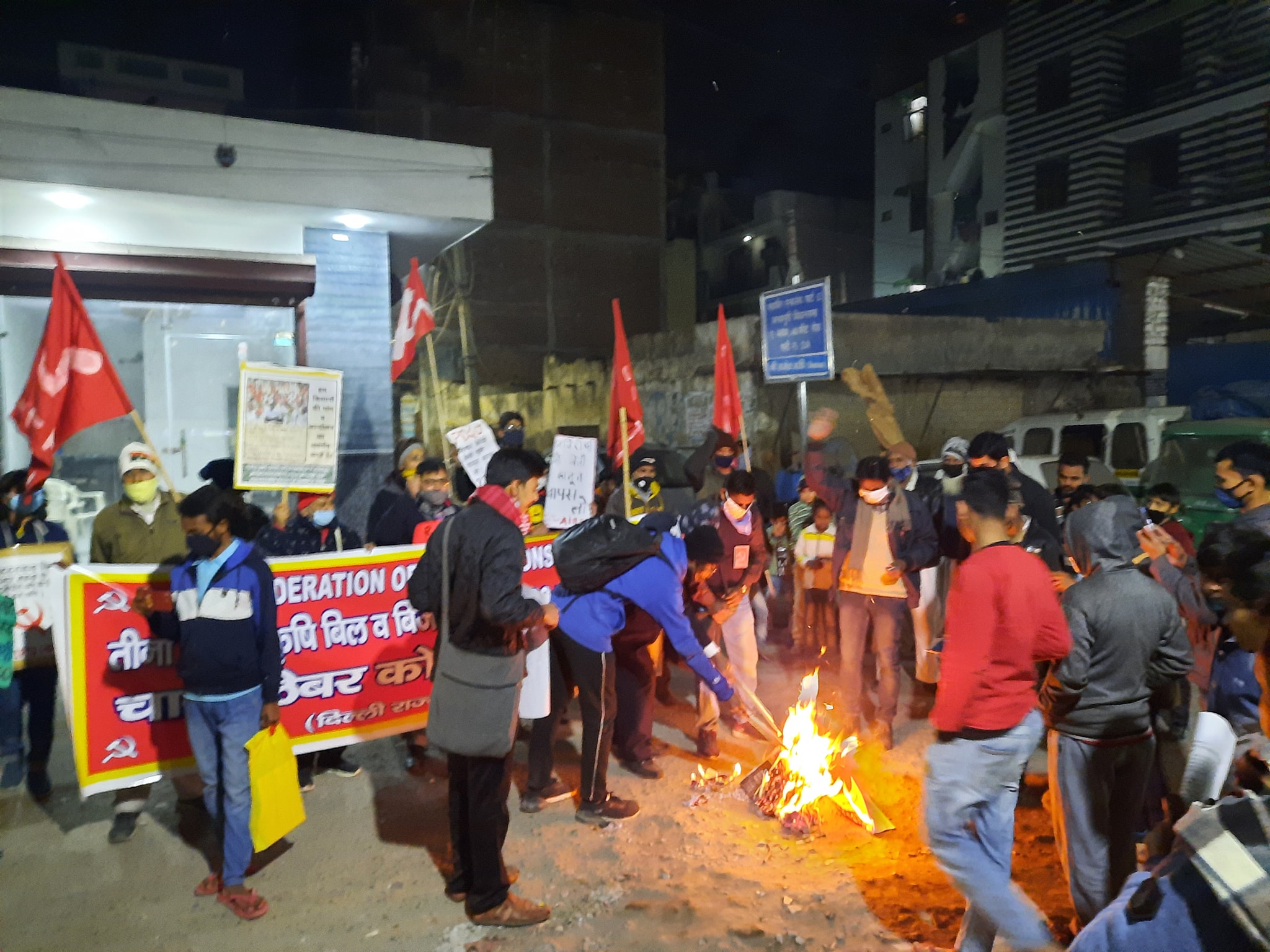 Mahaveer Enclave Part II, Delhi : On the occassion of Lodhi, protest demonstration were held across Delhi and also in Mahaveer Enclave Part II under the banner #DelhiForFarmers in which the copies of the 3 new farm laws and 4 labour codes were burnt.