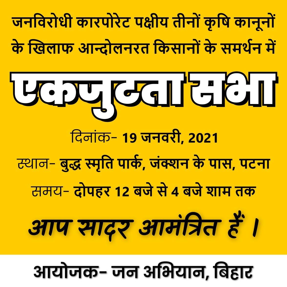 आज दस जनतांत्रिक एवं क्रांतिकारी संगठनों के साझा मंच जन अभियान, बिहार के तत्वावधान में बुद्ध स्मृति पार्क, फ्रेजर रोड, पटना में देश में चल रहे किसान आन्दोलन के समर्थन में 12 बजे दिन से 4 बजे शाम तक एक एकजुटता सभा का आयोजन किया गया। सभा में करीब 150 लोगों की भागीदारी हुई।एकजुटता सभा को जन अभियान, बिहार के घटक संगठनों के प्रतिनिधियों के अलावे अन्य जनवादी संगठनों के प्रतिनिधियों ने भी सम्बोधित किया। सभा में तमाम वक्ताओं ने 56 दिनों से दिल्ली के सरहद पर लाखों की तादाद में जुटे किसानों के न्यायपूर्ण आंदोलन का पुरजोर समर्थन किया। किसान आन्दोलन की प्रमुख मांगों – तीनों कारपोरेट पक्षीय कानूनों को रद्द करने, बिजली (संशोधन) कानून 2020 को वापस करने, पराली जलाने पर जुर्माना लगाने वाले कानून की वापसी सम्बन्धी किसान आन्दोलन की मांगों का लगभग सभी वक्ताओं ने समर्थन किया।