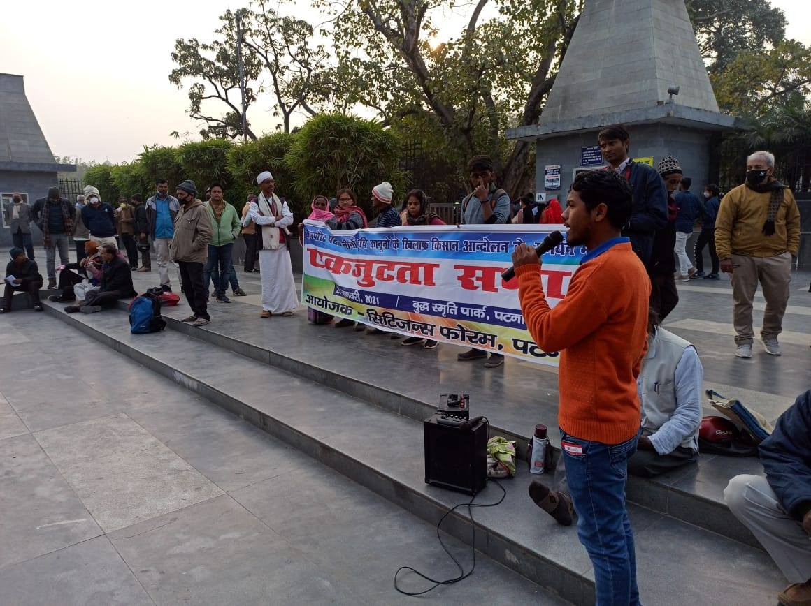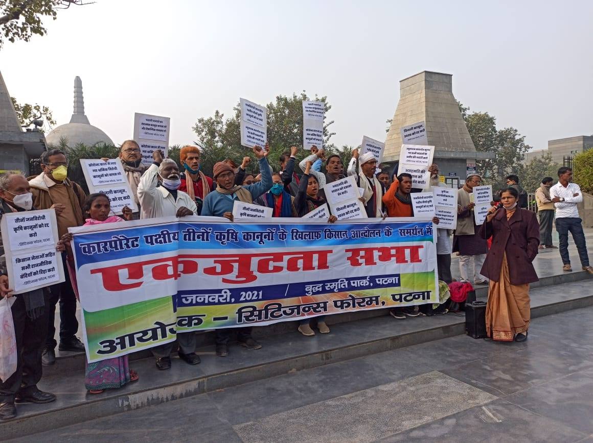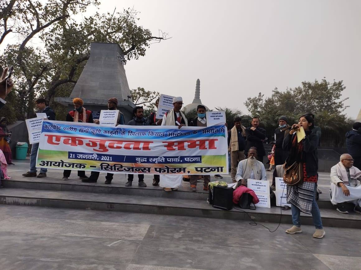 नागरिक सरोकारों और जनतांत्रिक अधिकारों के लिए काम करने वाला मंच ‘सिटीजन्स फोरम, पटना’ द्वारा किसानों के समर्थन में एकजुटता सभा का आयोजन बुद्ध स्मृति पार्क, फ्रेजर रोड पर किया गया। लगभग 4 घण्टे तक चली सभा में शहर के कई राजनीतिक-सामाजिक कार्यकर्ता, बुद्धिजीवी, संस्कृतिकर्मी, रंगकर्मी एवं साहित्यकार शामिल हुए।सभा में वक्ताओं ने इस बात पर जोर दिया कि कैसे यह कानून खेती-किसानी को पूरी तरह से बर्बाद कर देगा और किसानों को मजदूर बना देगा। सरकार कृषि क्षेत्र को पूंजीपतियों को देना चाहती है। वक्ताओं ने यह भी कहा कि मजदूर-किसान के जीने मरने से इस सरकार को कोई मतलब नहीं है। जमाखोरी, कालाबाजारी के लिए कानून लाया गया है। छात्र- नौजवान में बेराजगारी बढ़ती जा रही है, लेकिन सरकार कुछ भी करने के लिए तैयार नहीं है।