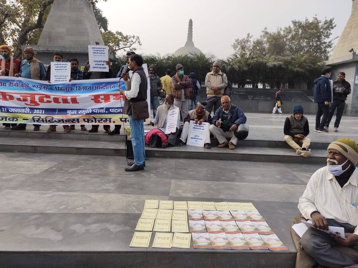 Patna, Bihar / 21 Jan 2021 : Citizens Forum, Patna (a platform dedicated to citizens’ interests and democratic rights) organized a meeting at Buddha Smriti Park in solidarity with the farmers who are struggling with their demands at Delhi borders since the last 58 days.The 4 hour long public meeting was attended by numerous political-social activists, intellectuals, cultural activists and literateurs along with the masses of Patna.