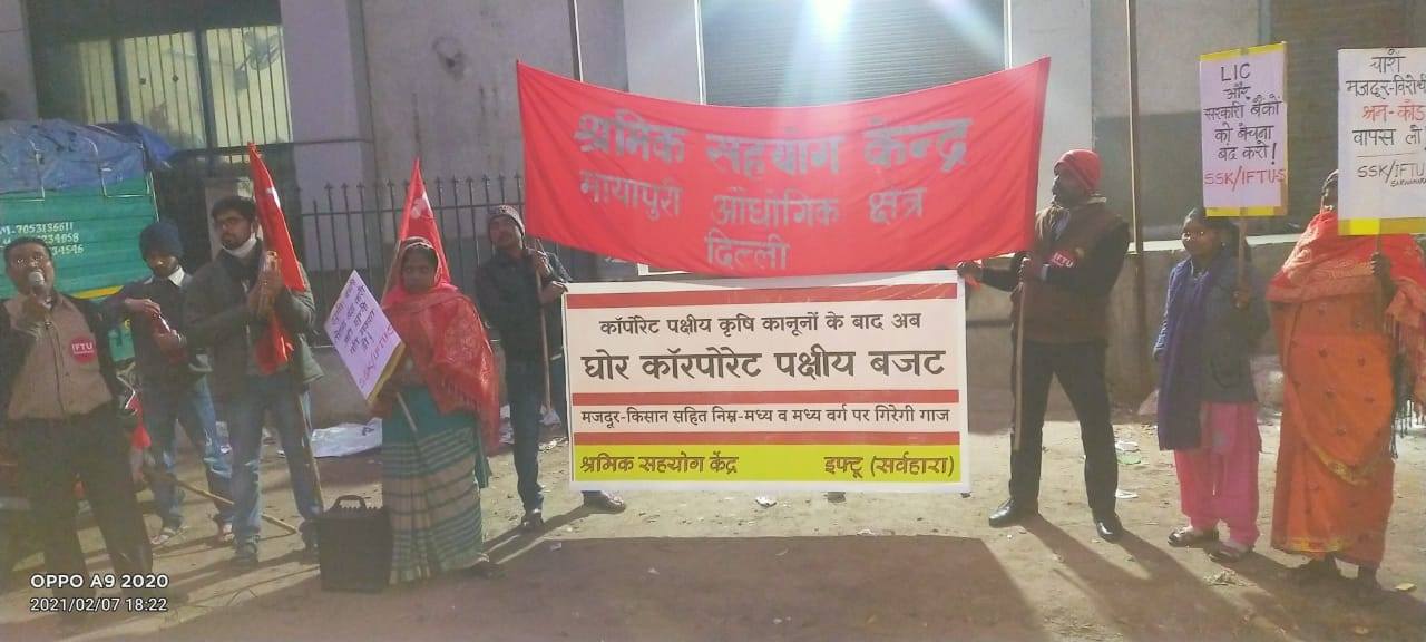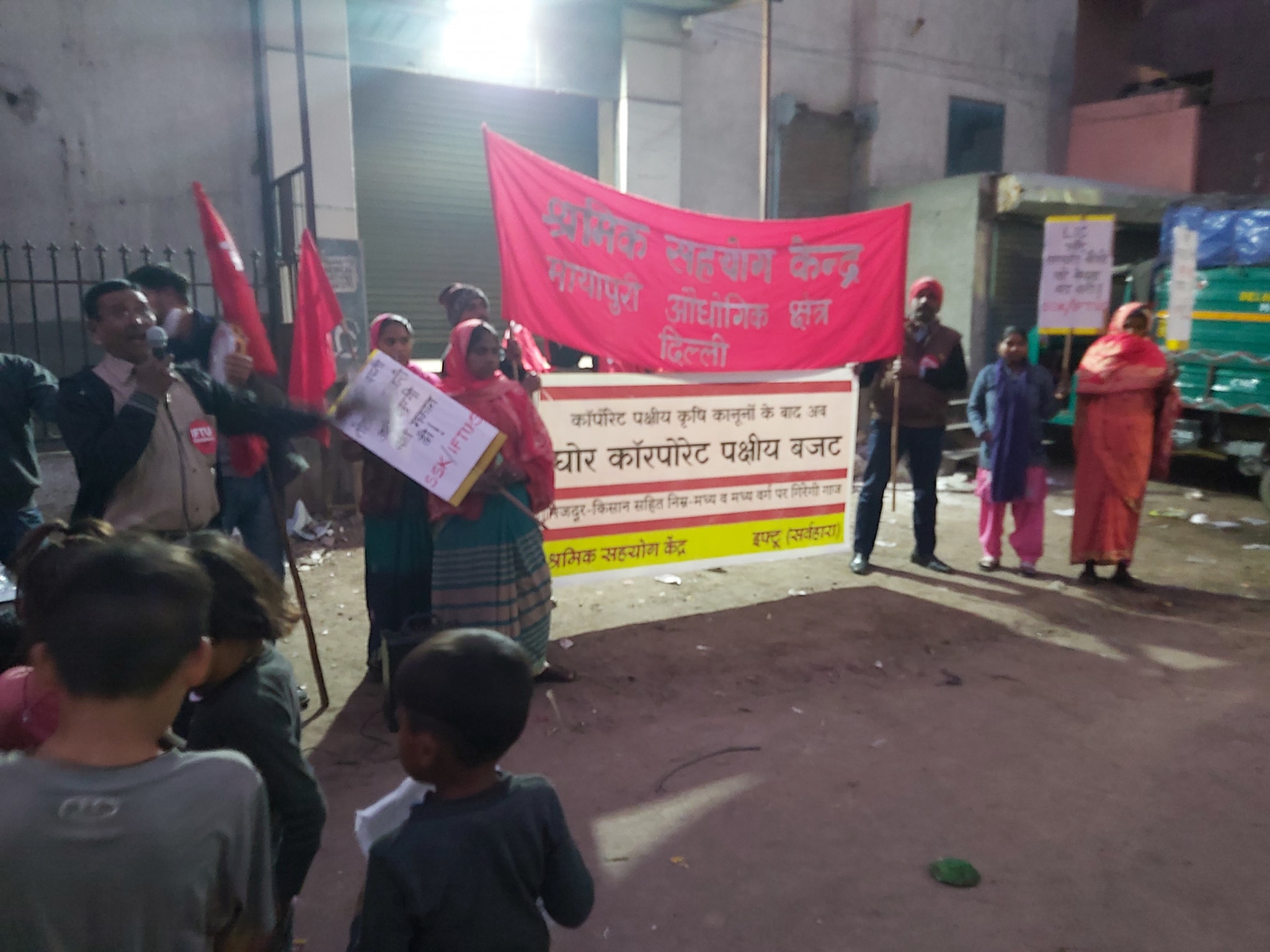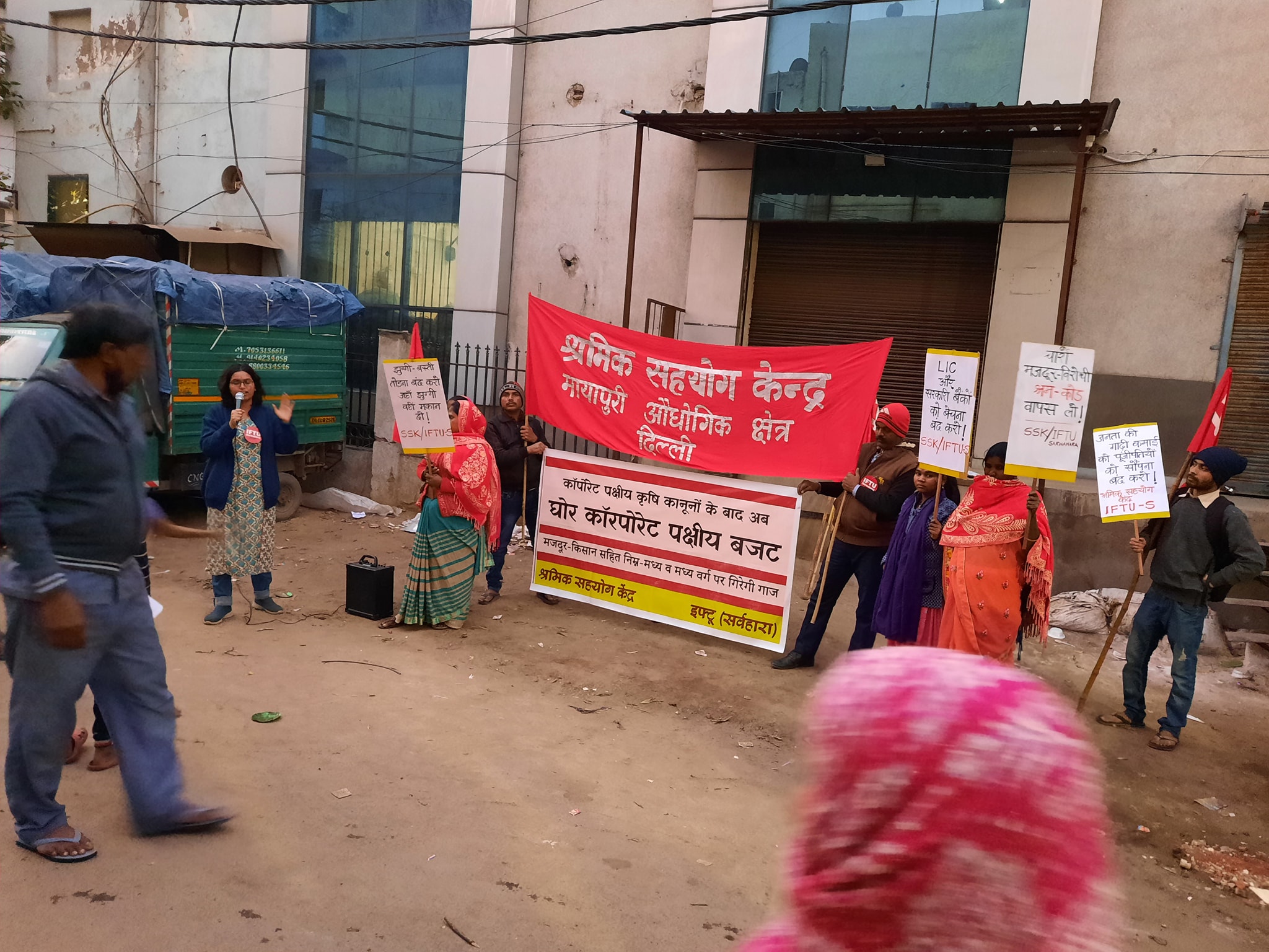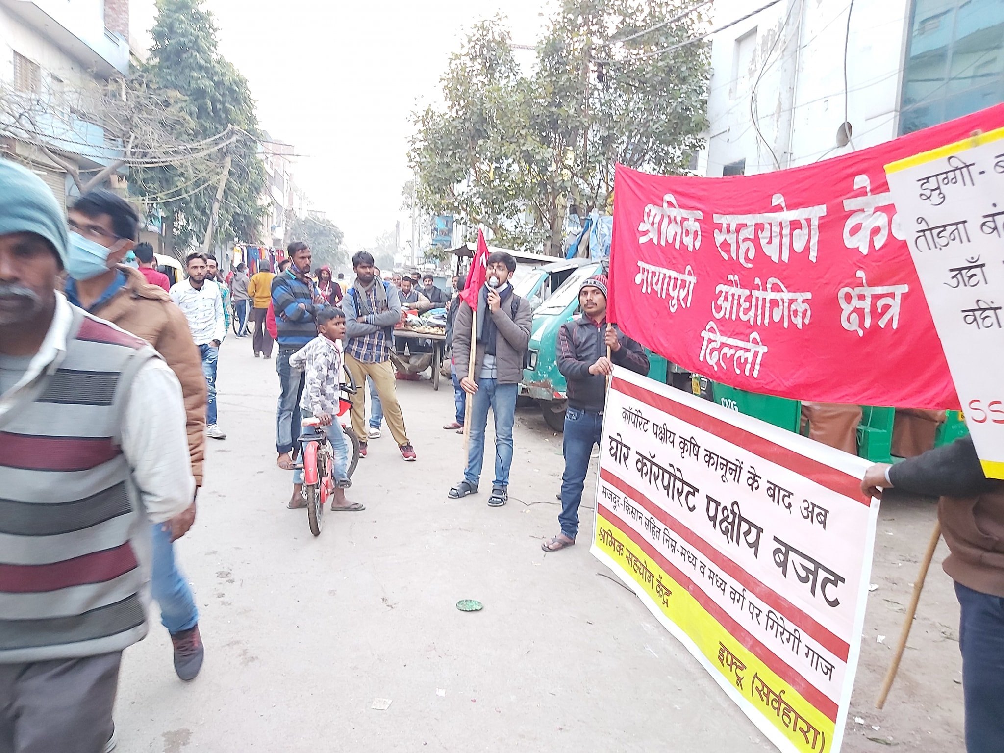 Mayapuri, Delhi : Against the extremely pro-corporate budget 2021, 4 anti-worker labour codes, 3 farm laws, rapid privatization of LIC, banks and PSUs, rising unemployment and deepening crisis on life and livelihood of toiling masses, a demonstration and mass meeting was organized in the workers basti and insustrial area of Mayapuri in Delhi.