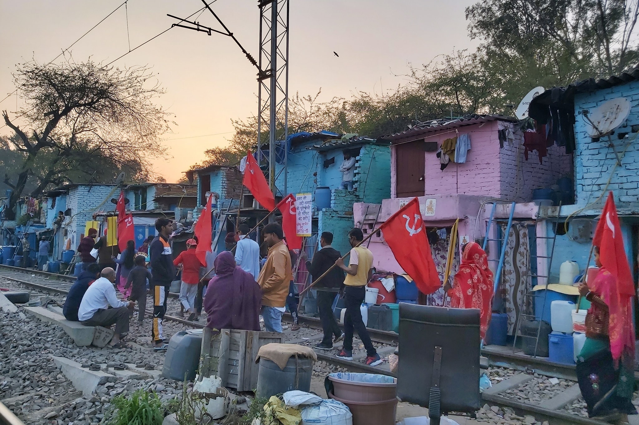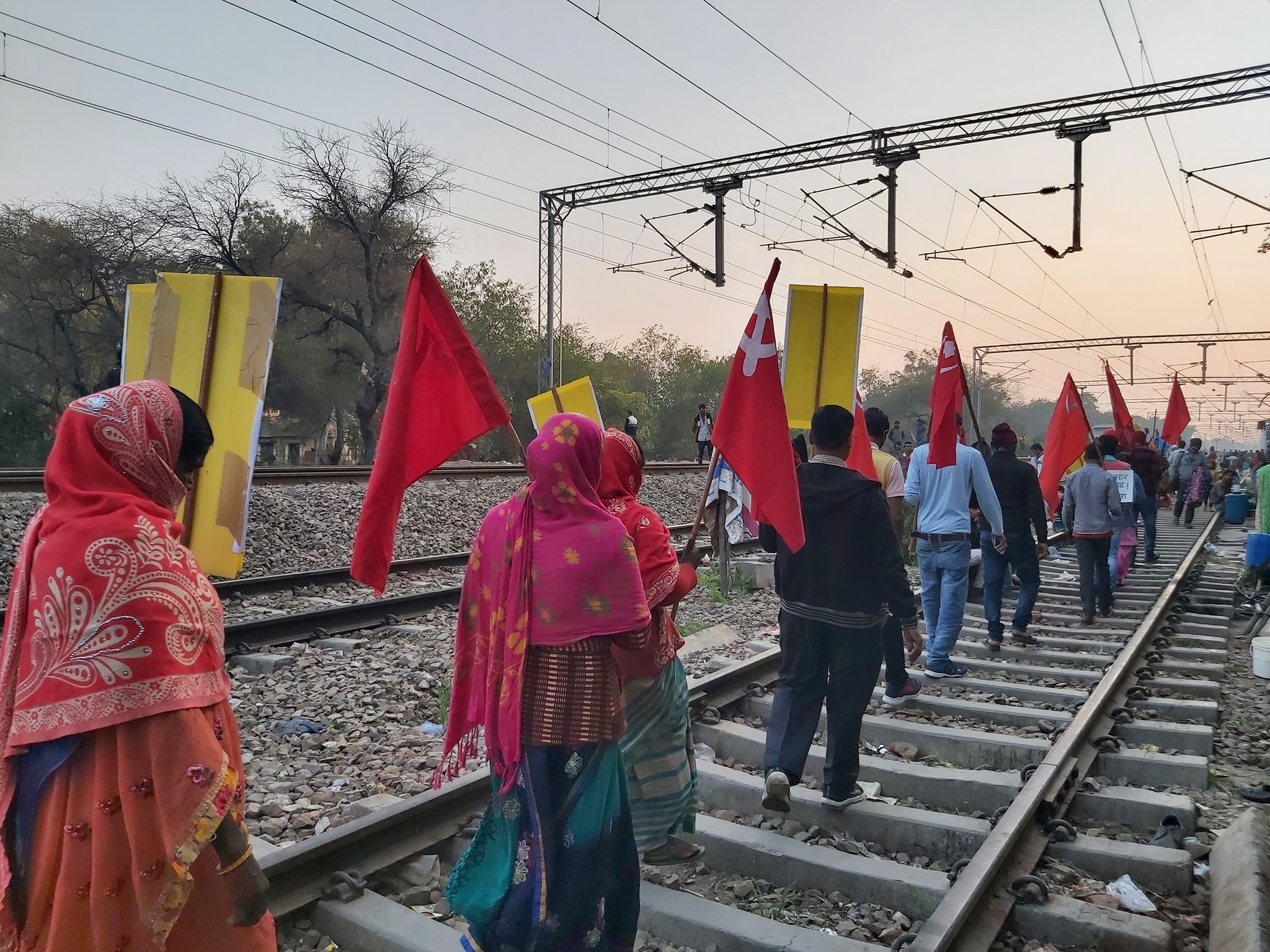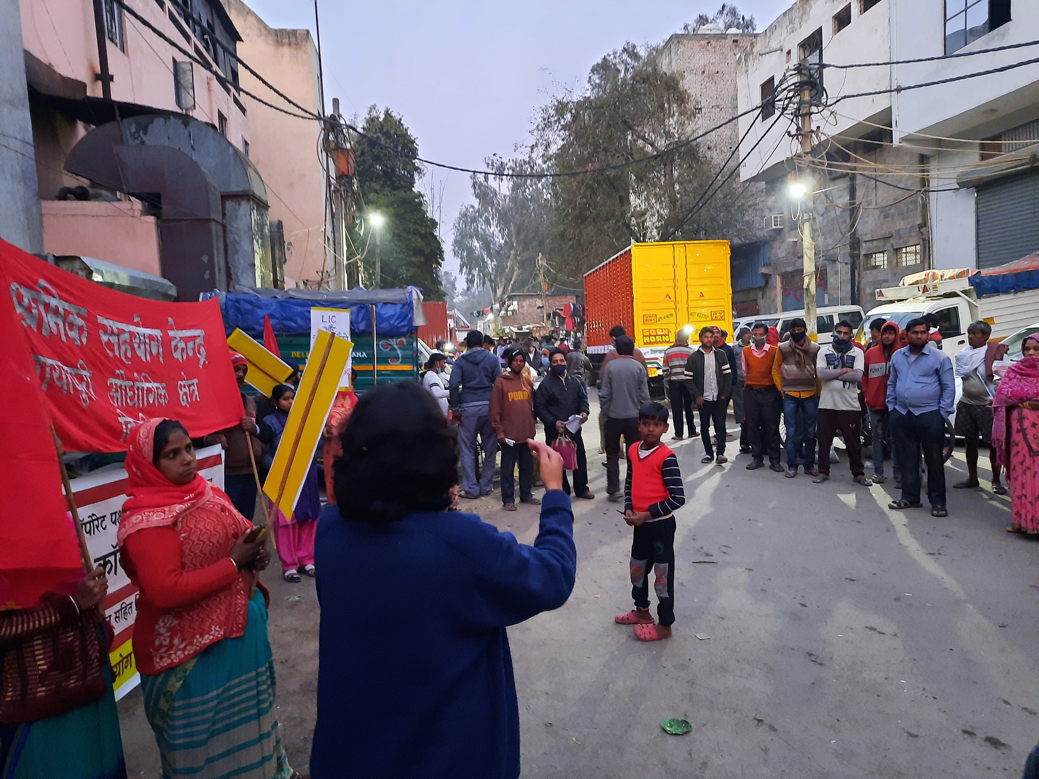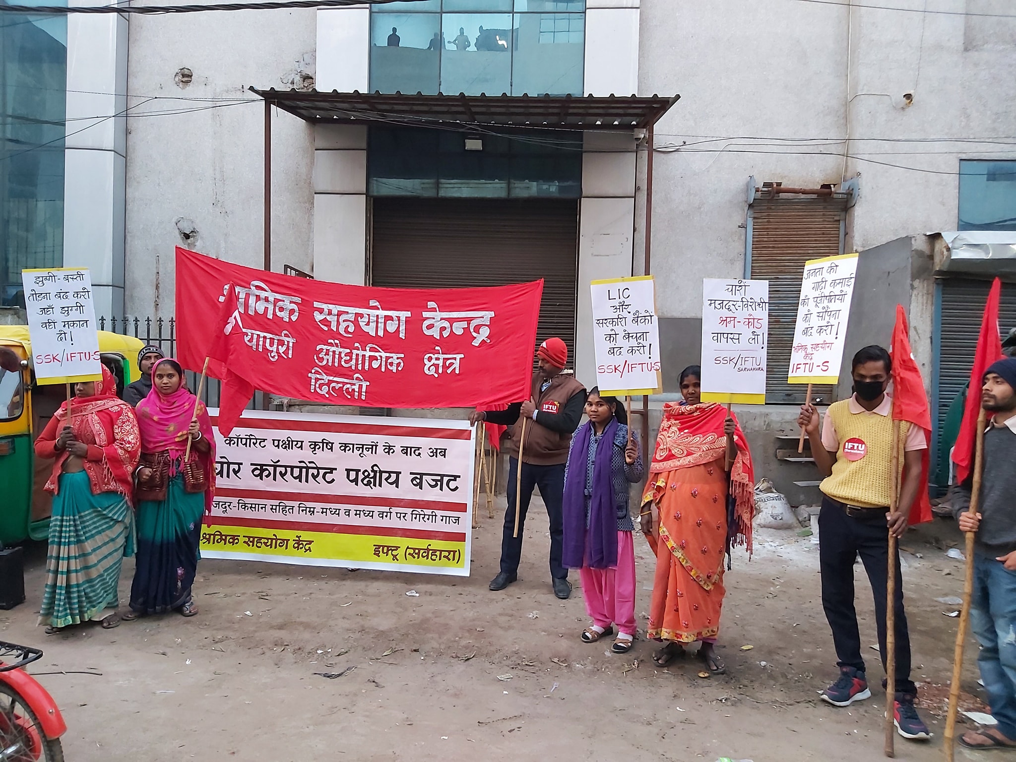 Mayapuri, Delhi : Against the extremely pro-corporate budget 2021, 4 anti-worker labour codes, 3 farm laws, rapid privatization of LIC, banks and PSUs, rising unemployment and deepening crisis on life and livelihood of toiling masses, a demonstration and mass meeting was organized in the workers basti and insustrial area of Mayapuri in Delhi.
