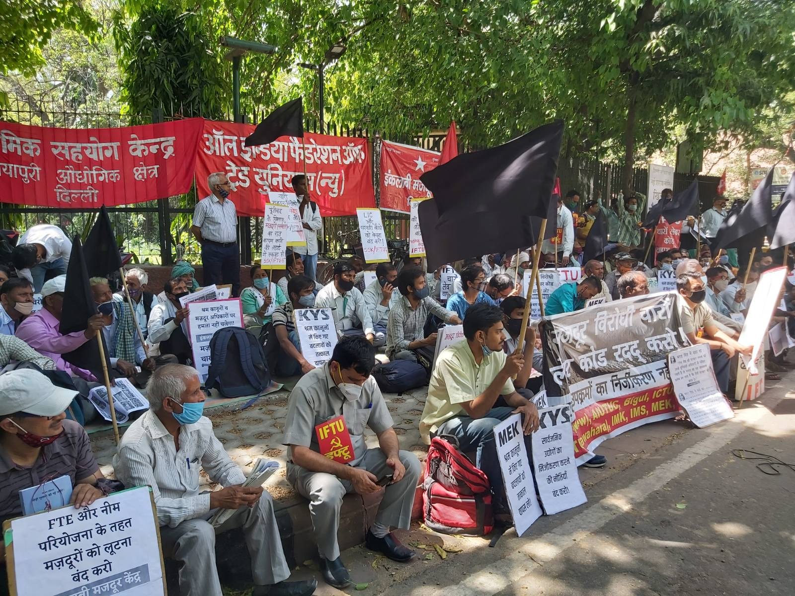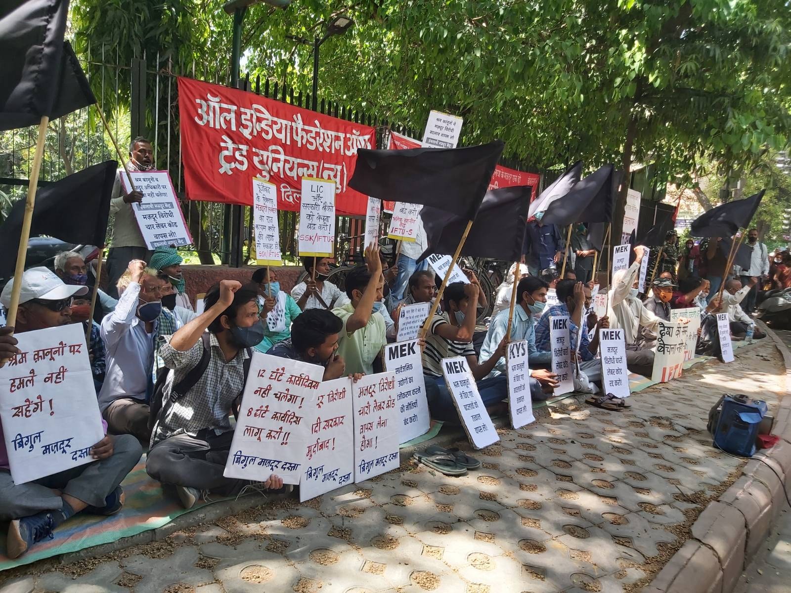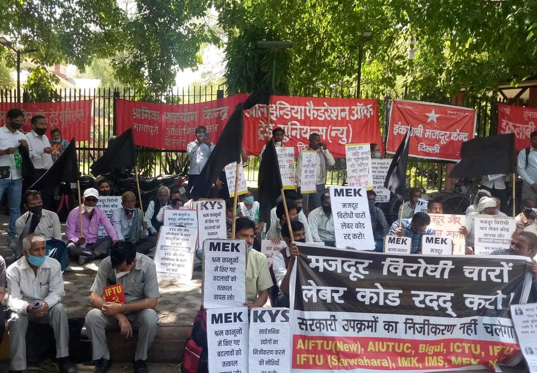 चारों मजदूर-विरोधी लेबर कोड वापस लो!लेबर कोड लागू करने की कोशिशों, मजदूर अधिकारों पर हमले, व सरकारी उपक्रमों के निजीकरण के विरुद्ध जंतर मंतर पर भिन्न क्रांतिकारी ट्रेड यूनियनों व मजदूर संगठनों ने काले झंडों के साथ आयोजित किया विरोध प्रदर्शन और मनाया काला दिवस, द्वारा नामतः AIFTU (न्यू), AIUTUC, बिगुल, इक्टू, इफ्टू, इफ्टू (सर्वहारा), इमके, IMS, KNS, MEK, NTUI।