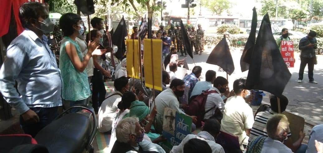 Protest demonstration with black flags held at Jantar Mantar observing black day against the implementation of the new labour codes, attacks on worker rights, and privatization of PSUs by various revolutionary trade unions and worker organizations viz. AIFTU (N), AIUTUC, Bigul, ICTU, IFTU, IFTU (S), IMK, IMS, KNS, MEK, NTUI.