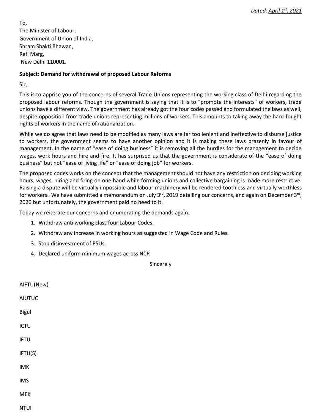It is noteworthy that the Modi Government had earlier declared the implementation of labour codes from 1st April 2021 but has informally postponed it citing delay from States in formulating the Rules for the Codes.