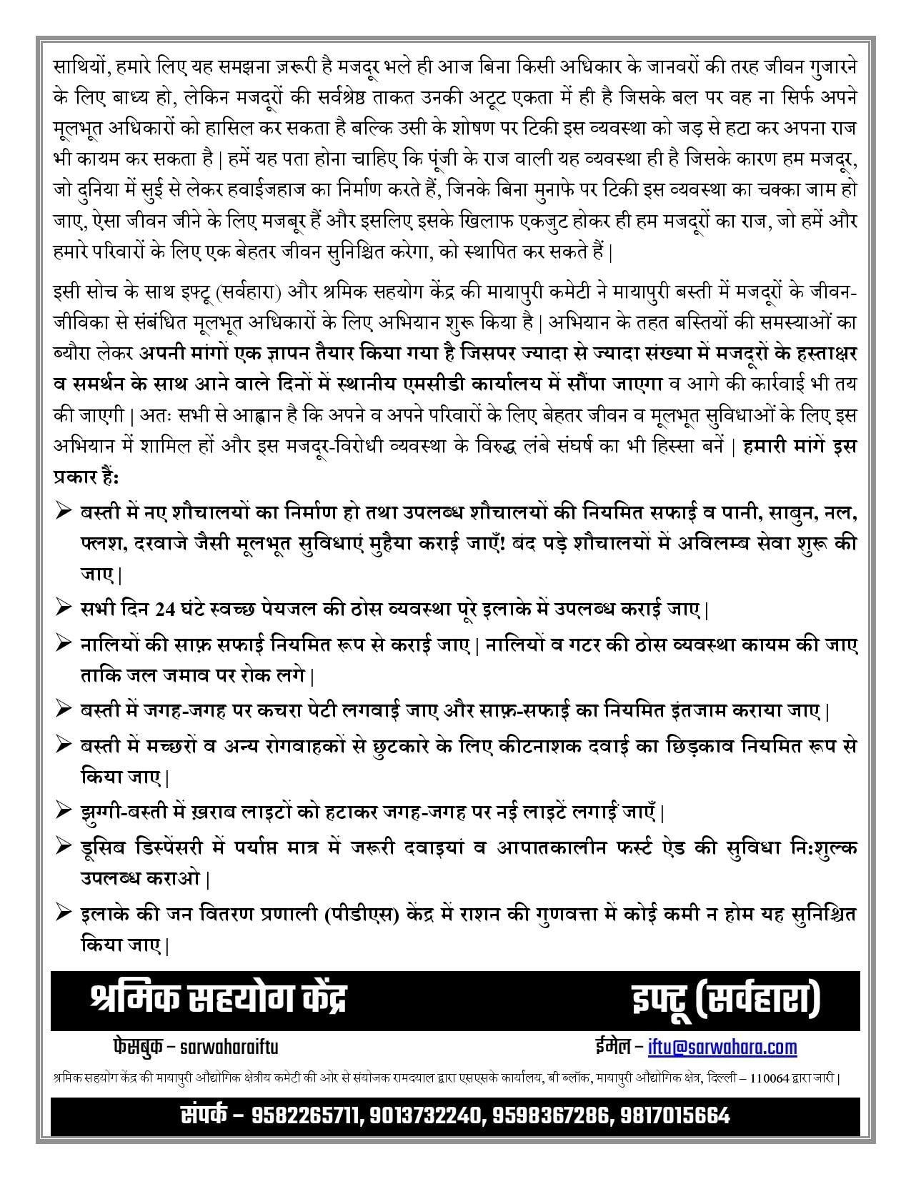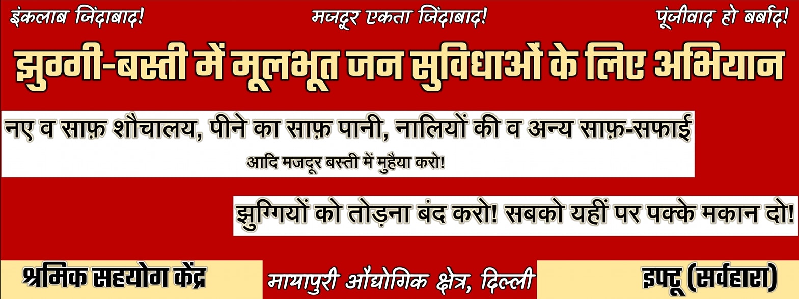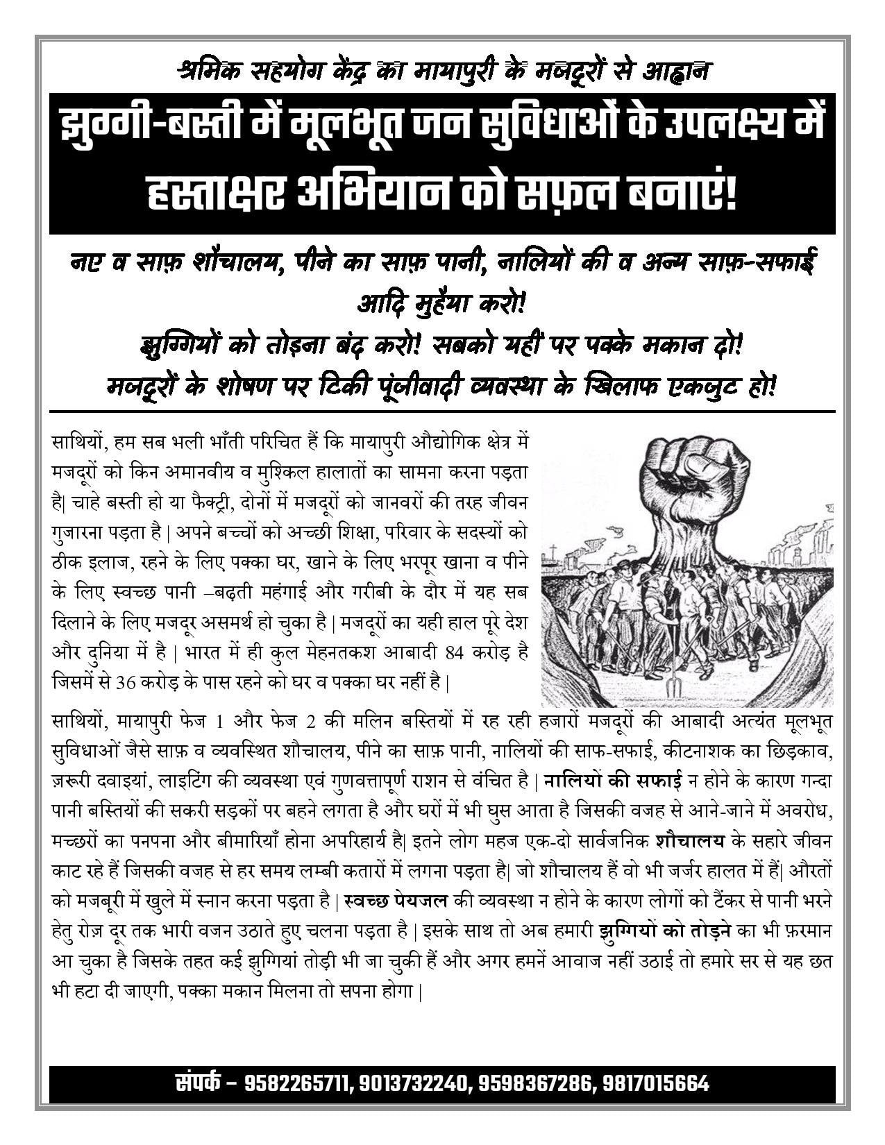 श्रमिक सहयोग केंद्र की मायापुरी औद्योगिक क्षेत्रीय कमेटी ने झुग्गी-बस्ती में रहने वाली जनता के समक्ष बस्ती में मूलभूत जन सुविधाएं जैसे साफ व नए शौचालय, 24/7 स्वच्छ पेयजल, साफ-सफाई व नालियों की बेहतर व्यवस्था, बिजलीकरण आदि मुहैया कराने की मांग पर अभियान की शुरुआत की।