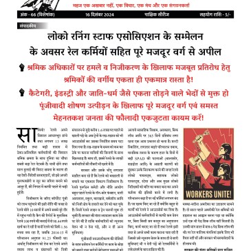 संपादकीय | 16 दिसंबर 2024‘सर्वहारा’ #66 | रेलवे विशेषांक [Click here to read in English] लोको रनिंग स्टाफ एसोसिएशन (AILRSA) के केंद्रीय सम्मेलन के अवसर पर रेल कर्मियों सहित पूरे मजदूर वर्ग से अपील श्रमिक अधिकारों पर हमले व निजीकरण के खिलाफ मजबूत प्रतिरोध हेतु श्रमिकों की वर्गीय एकता ही एकमात्र रास्ता है! कैटेगरी, इंडस्ट्री … More श्रमिक अधिकारों पर हमले व निजीकरण के खिलाफ श्रमिकों की वर्गीय एकता ही एकमात्र रास्ता है!