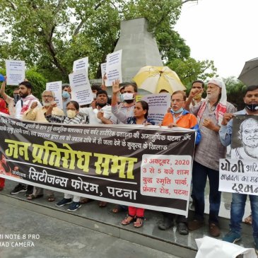 UNITE AGAINST RISING CRIMES AGAINST WOMEN, HATHRAS GANGRAPE-MURDER, AND STATE’S INHUMANE AND BARBARIC ACTIONS! Patna, 3rd October 2020: In times of rapidly rising barbaric violence and crimes against women, a protest demonstration was organized by Citizens’ Forum at Patna’s Buddha Smriti Park despite rains, against the gangrape-murder of a dalit teenager in Hathras (UP) on … More Hathras Gangrape-Murder: Protest Demonstration in Patna [Citizens’ Forum]
