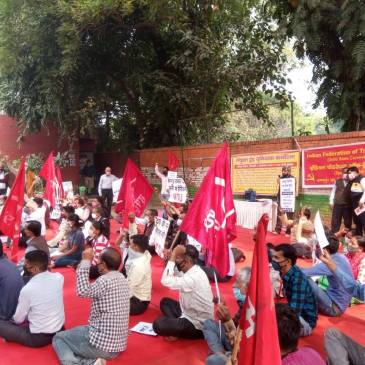 Protest demonstration with black flags held at Jantar Mantar observing black day against the implementation of the new labour codes, attacks on worker rights, and privatization of PSUs by various revolutionary trade unions and worker organizations viz. AIFTU (N), AIUTUC, Bigul, ICTU, IFTU, IFTU (S), IMK, IMS, KNS, MEK, NTUI. It is noteworthy that the … More Protest Demonstration to Repeal 4 Anti-Worker Labour Codes (Delhi / 1 April 2021)