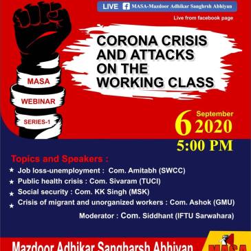 FB LIVE: Mazdoor Adhikar Sangharsh Abhiyan’s Webinar Series / 6 Sep 2020 … More MASA Webinar Series – 1: Corona Crisis & Working Class